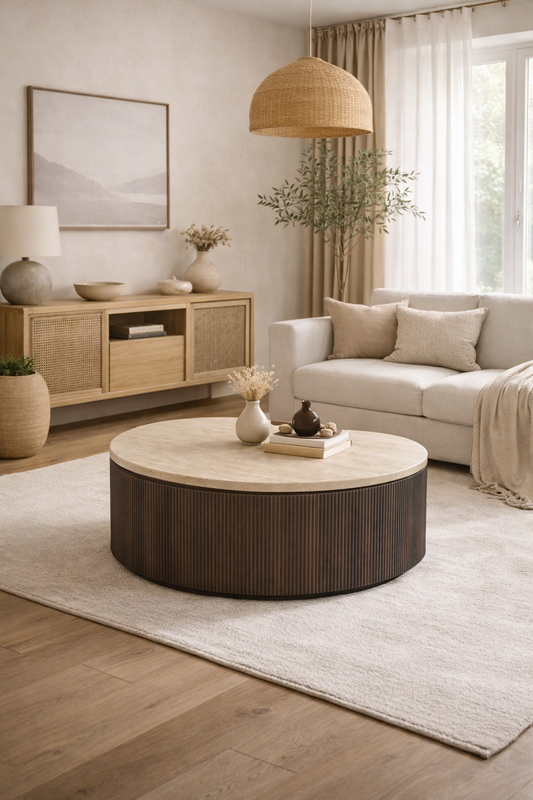 Salontafel Sora 90 cm – Japandi Travertin Natuursteen - Bruin