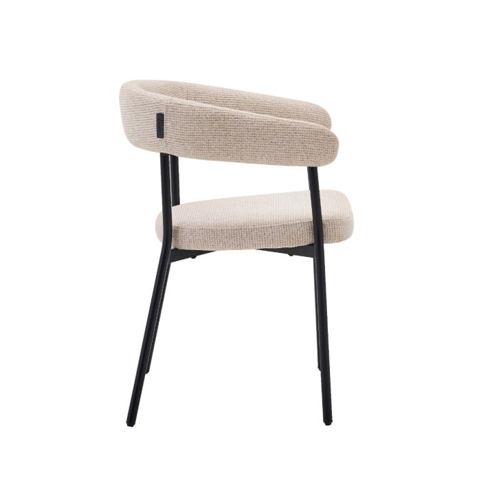 De Niko eetkamerstoel is een unieke combinatie van minimalistisch Japans design en optimaal comfort. De onvermijdelijke, gebogen rugleuning en zachte crèmekleurige stoffering creëren een elegante en uitnodigende uitstraling. Het slanke metalen onderstel in zwart vormt een krachtig contrast met de lichte bekleding en geeft de stoel een moderne en stijlvolle uitstraling die perfect aansluit bij zowel lichte als donkere interieurs.